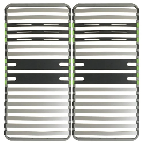 Lot de 2 Sommiers à lattes Altozone 80×200 cm.Un sommier possédant 2 zones différenciées, pour un confort optimal. Zone du bassin renforcée pour un meilleur soutien. Zone d’épaule assouplie pour limiter les pressions. Il est composé de 14 lattes en bouleau multiplis largeur 53 mm , épaisseur 8 mm, et 2 lattes larges en bouleau multiplis largeur 151 mm , épaisseur 8 mm.Structure tube métal carré,laqué epoxy coloris gris. Coins arrondis. Système de fixation avec 2 pieds centraux inclus pour lier entre eux les deux sommiers.Dimensions : 78x 198x H4,5 cm.