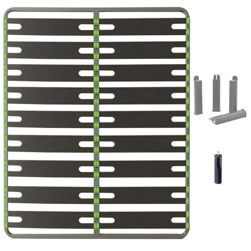 Pack AltoSenso composé de :1x Sommier AltoSenso 160x200cm1x Jeu de 4 Pieds Gris1x Pied CentralUn ensemble prêt à l’emploi pour bénéficier d’un couchage sur pieds. Parfait pour un couchage enfant ado ou adulte.Sommier :Composé de 2×9 lattes larges multiplis largeur 151 mm, épaisseur 8 mm. Embouts en polypropylène vert. Structure tube métal carré,laqué epoxy coloris gris. Coins arrondis.Pieds :Jeu de 4 pieds en polypropylène gris pour sommier à lattes. Hauteur 22 cm. Coloris : gris – Vis et notice fournies.Pied Central : Permet un meilleur maintien de votre sommier . Hauteur : 22cm. Couleur : noir. Vis et notice fournies.Dimensions Sommier : 158 x 198x H4,5 cmDimensions Pieds : 5 x 4 x H22cmDimensions Pied Central : 6 x 6 x H22 cm