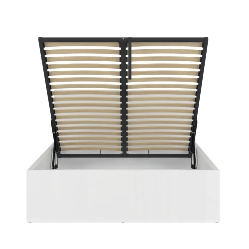 Lit coffre 140×200 sommier inclus Edwin Blanc Fabrication Européenne – Collection : Edwin – Couleur : Blanc laqué – Matériaux : Panneaux MDF et de particules – Sommier avec cadre en métal et latte en bois – Caractéristiques: Sommier coffre inclus – Verin à gaz avec amortisseur – 1 grand coffre de rangement divisé en 2 compartiments – Poids maximum conseillé : 200 kg – Matelas non inclus – Poids et dimensions : 106 kg – 149 x 204 x 40 – 95 cm – Produit livré, à monter – Produit garanti 12 Mois.