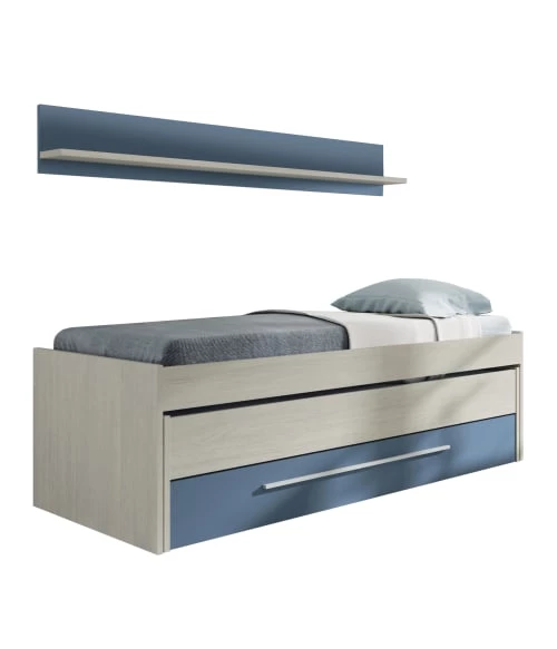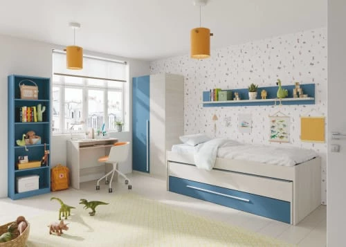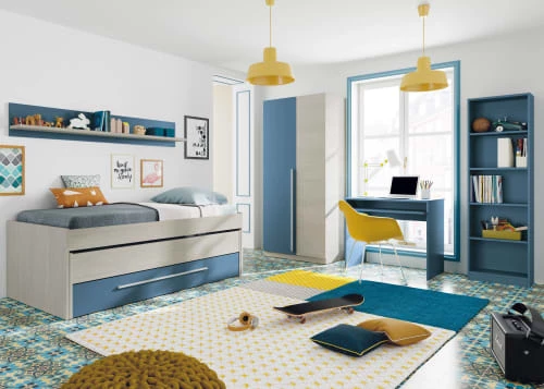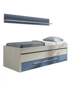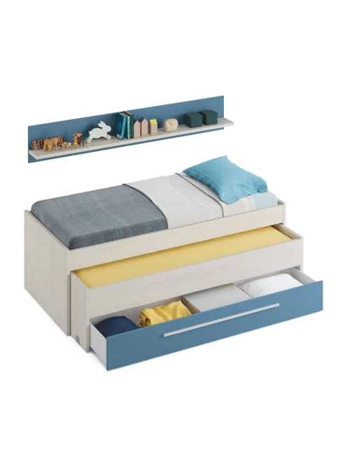 Cadre de lit avec deuxième lit gigogne avec commode et étagère murale assortie. Cette composition représente une excellente solution de gain de place : en effet avec un cadre de lit simple vous avez l’espace pour accueillir deux personnes en cas de besoin, et la commode en partie basse vous permet de ranger de manière ordonnée et discrète revêtements et draps. ou jeux d’enfants. Le détail bleu clair de la commode et de l’étagère rend cette composition parfaite pour une chambre de garçon. Les filets sont inclus, la commode et le lit inférieur sont équipés de roulettes cachées : construit entièrement en stratifié, il résiste aux chocs et aux rayures et est durable dans le temps. Dimensions en cm cm 199x65x96: lit supérieur 190 x 90, lit inférieur 180 x 90, étagère 180 x 22,5 x 19.