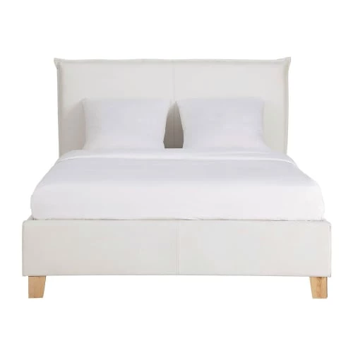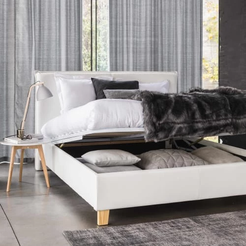 Envie d’une chambre lumineuse ? Optez pour ce lit coffre avec sommier à lattes 140×190 blanc PILLOWrevêtu de textile enduit aspect cuir. Monté sur des pieds en pin clair, ce lit au design moderne s’intègrera parfaitement à une déco nordique ou plus urbaine. Le détail déco : malin, l’espace de rangement sous le lit. Notre conseil: disposez un grand plaid en fausse fourrure pour parfaire votre nid douillet. Pour un total look white, associez-le à une table dechevet blanche.