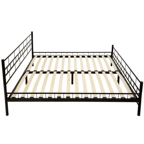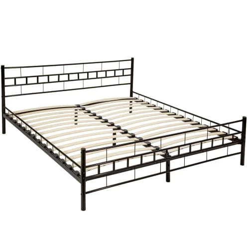 Lit Adulte Métal avec Sommier à Lattes en Bois Design 2 Personnes Morphée Blanc TECTAKE. Ce magnifique lit en métal vous offre de beaux rêves et un sommeil réparateur. Son design intemporel fait de votre lit un véritable accroche regard, il embellira sans nul doute n’importe quelle chambre à coucher. Le cadre en acier est robuste et stable, il est traité par un revêtement de poudre ce qui lui confère un effet antistatique et résistant aux chocs et aux rayures. Cadre métallique de lit avec sommier à lattes en bois de peuplier souple. Des pieds en plastique protègent le plancher de votre chambre. Dimensions totales du cadre de lit (LxlxH) : environ 203 cm x 187 cm x 76 cm.Dimensions de la surface couchage (Lxl) : environ 200 cm x 180 cm. Hauteur Pieds de lit : environ 47 cm. Hauteur Tête de lit : environ 76 cm. Hauteur du plancher au sommier à lattes : 25 cm. Poids : environ 25 kg. Matériau : Cadre en acier peint par poudrage, Pieds en plastique, Bois de peuplier.